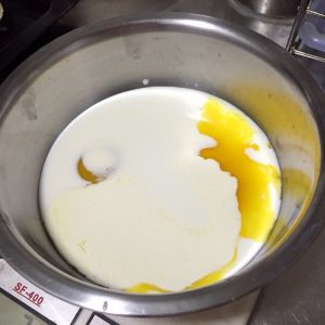 把淡奶油装入稍大点的容器里,加入牛奶拌匀。