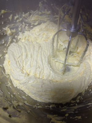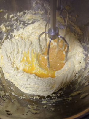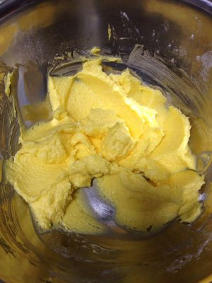 搅拌均匀后用打蛋器打发黄油混合物,打发到颜色变浅,体积膨大即可。