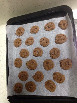 放入裱花袋,挤出饼干,撒上巧克力豆;预热烤箱