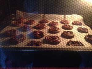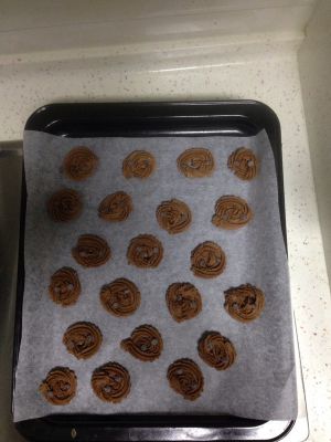 将面糊装入裱花袋,我愿用的是中号的菊花形的裱花嘴,烤箱预热150°C,上下火,烤盘放入中层,10分钟左右,根据挤成的大小调整温度与时间。