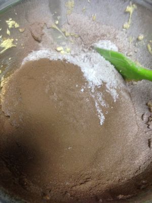 加入筛过的面粉和可可粉,用橡皮刮刀混合均匀。