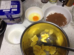 之后加入牛奶,鸡蛋,搅拌均匀可以借助打蛋器搅拌均匀,然后筛入可可粉,面粉