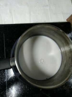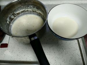 牛奶加糖及淡奶油,小火搅拌,等糖融化放凉