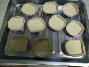 蛋挞皮(皮子可以买成品,方便的很)放入烤托盘,加入蛋挞水,如图。不要太满,