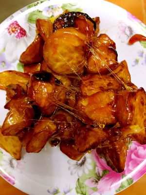 锅里留少许油,倒入白糖,小火熬至红色,倒入地瓜改大火,马上倒出,