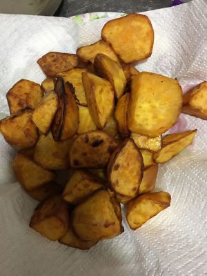 1.将地瓜洗净去皮后切滚刀块备用 2.锅中放油加热后倒入地瓜,炸至通体金黄后放盘中吸油纸上备用