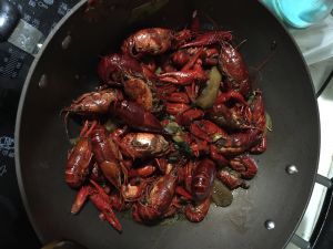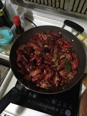 清洗好,控水。然后开锅。倒入油适量。温油中倒入花椒炸香,然后将所有配料放进锅里煸炒。炒出香味以后就可以倒入小龙虾。这个时候小龙虾还是活的,还可以在锅里翻滚。吼吼。翻炒一会就可以依次倒入酱油,盐,料酒,红烧汁,翻炒。最后倒入啤酒,啤酒稍微没过小龙虾就可以了。然后就大火烧个10分钟,注意中间适当翻炒入味。看锅内汤汁差不多收汁了就放入白糖,然后翻炒,就可以关火了。