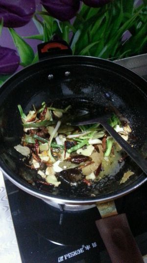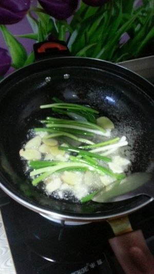 热锅倒油,可以稍多到点,油热放葱姜蒜煸炒一会出香味