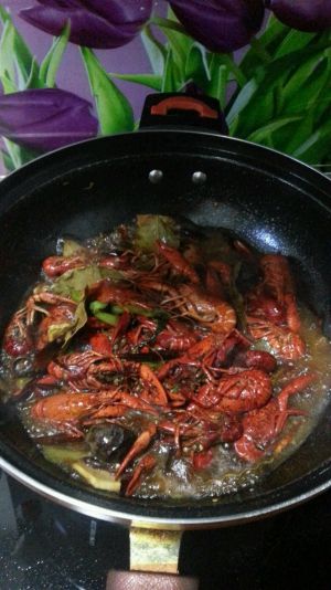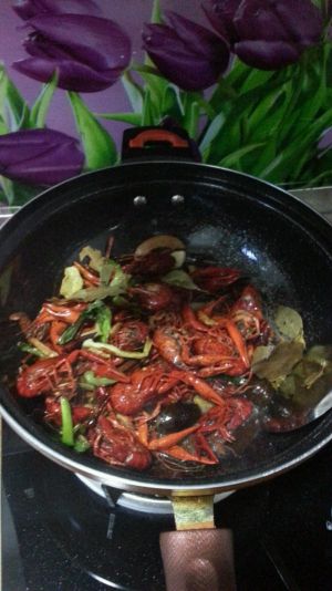 下小龙虾翻炒一会,可以加点白酒,啤酒也可以,去去腥,料酒也可以。翻炒一会变色后加水煮吧。我用的是虾头壳煮的汤,味道更好一些,清水也可以,
