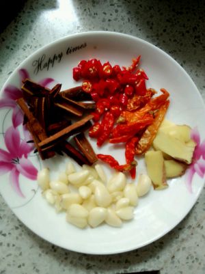 葱切段,蒜拍碎,姜切片,在准备一些丁香,肉寇,花椒,麻椒,香叶,干红辣椒
