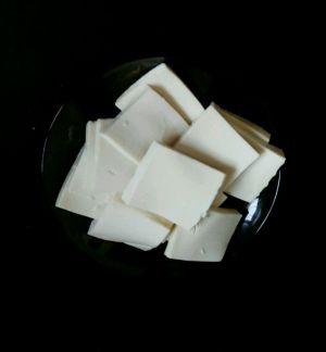 豆腐切成薄块,锅中油至7成热,将豆腐块放入锅中,煎至两面金黄。