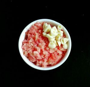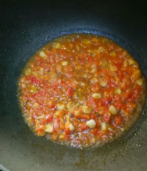 锅中留少许油,炒香蒜片,倒入西红柿碎,加半碗水,炖至西红柿泥汤浓稠。