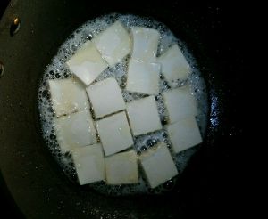 热锅加油,油热将豆腐切厚片下锅煎制。