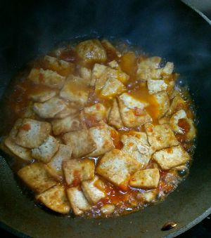 豆腐炸好,倒出,锅里放番茄沙司适量,放白糖适量,放醋适量,加点同时点点酱油,把豆腐放进去勾芡收汁就好啦。