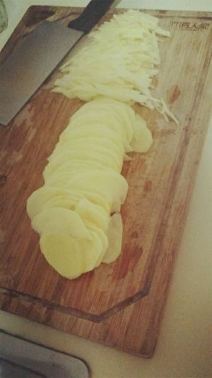 一:将土豆去皮 然后切成薄片 最重要的是切完要按照我图上那样摊开, 那样容易将土豆丝切的完美。。哈哈