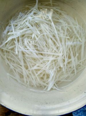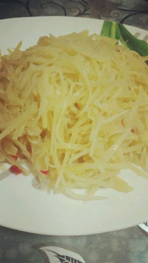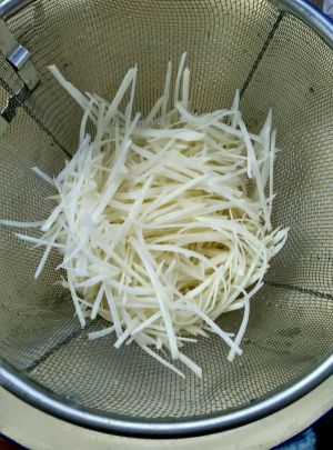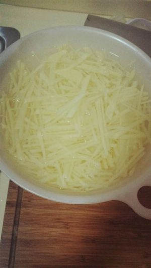 二:将切好的土豆丝放入水中,这样做可以去除土豆丝多余的淀粉!一定要用水多洗几遍,那样炒出来的土豆丝丝丝分明。。。