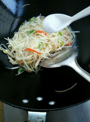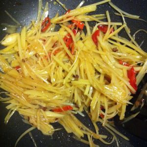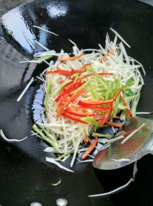 油锅搁上,放入花椒炸香,然后把花椒挑捡初来,放入葱姜蒜爆香,然后放入土豆丝翻炒,放入胡萝卜翻炒,迅速放入醋,盐继续翻炒,再放入青椒继续炒啊炒,后加入盐,鸡精,十三香……出锅啦~