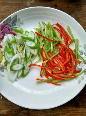 胡萝卜切丝,青椒切丝,葱姜蒜切沫,一切准备就绪……