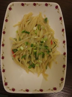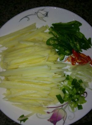 将油热开先放辣椒大葱爆炒一下再倒入土豆丝一起翻炒一下加入醋鸡精盐,再翻炒一下即可,倒入盘中撒上葱段美美的一道菜就完成了