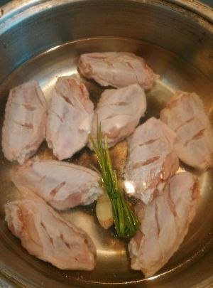 鸡翅洗净,每块划两三刀,加水、姜片、料理煮至沸腾起沫。