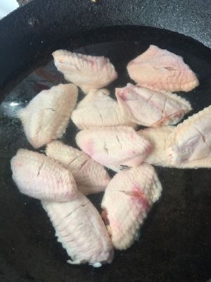 把鸡翅洗干净,两面各划上两刀,冷水入锅,加入葱和姜,煮出浮沫,倒出冲洗干净