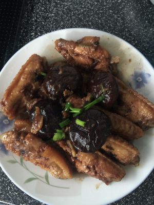 泡发干香菇备用,捞起鸡翅,晾干,锅里加油,将鸡翅一一煎至金黄,加可乐漫过鸡翅,加生抽,水,中火15分钟后加盐小煮5分钟关火起锅。