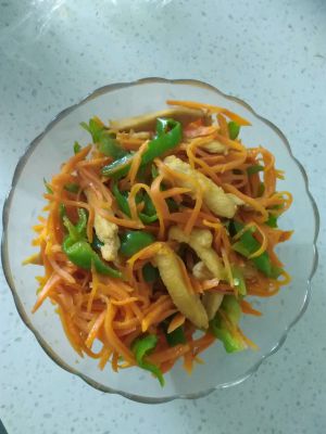 胡萝卜、青椒、瘦肉切丝,锅内放油,油热后放入瘦肉、生抽、料酒中火翻炒1分钟后加入胡萝卜,继续翻炒2分钟后加入青椒。