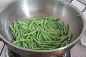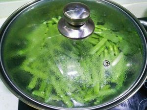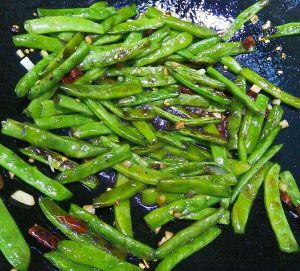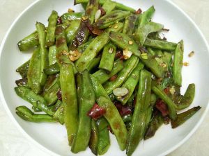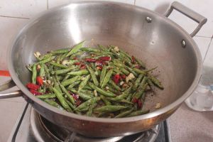 坐锅烧热后放比平时多两倍的油。放入四季豆小油炸至金黄色。