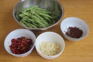四季豆洗净切斜段,干辣椒切段,大蒜切米,花椒备好。