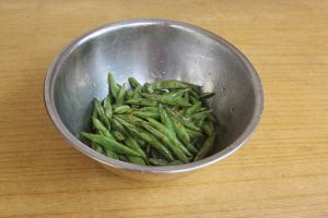 四季豆摘去老筋,用手掰成长约6cm长的段,洗净,沥干水分。