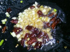 锅内放油,加入花椒炒香后捞出,再加入葱白、干红辣椒、蒜粒