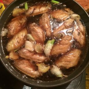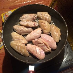 用小火慢慢煎一下鸡翅。煎了的鸡翅能锁紧肉质,更能逼出油脂,以至于不太腻。