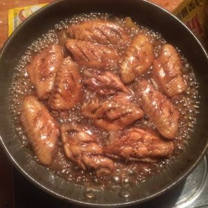等到鸡翅两面的颜色都变的时候倒入酱油和少许的可乐没过鸡翅(依个人口味加入)最后盖上锅盖静等即可
