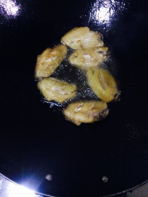 鸡翅洗净斜切3刀焯水,水里放少许料酒,捞出沥干,煎至两面金黄