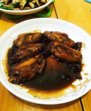 煎好鸡翅放入八角翻炒几下倒入可乐放少许老抽,大火烧开后转小火煮15分钟左右,大火收汁翻炒几下,装盘