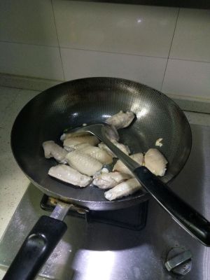 姜片煸香,芝麻油适当下点,不粘锅小火把鸡翅膀煎到一边上色