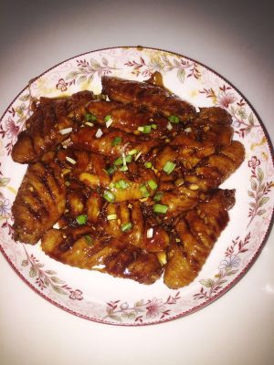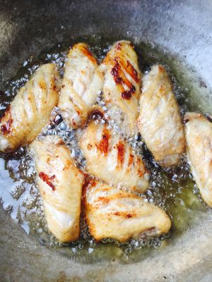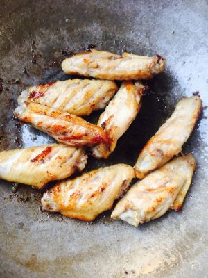 煎炸好鸡翅以后,倒出油,鸡翅留锅内。