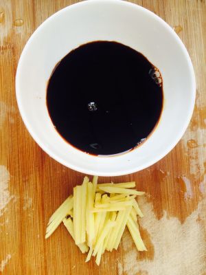 姜切粗丝,备好一碗汁:放入1汤勺酱油、5汤勺生抽、1/2茶勺盐、搅匀备用一旁。