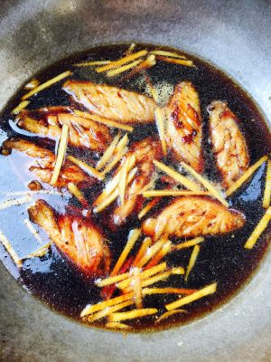 将姜丝均匀的撒在锅里的鸡翅上,倒入备好的酱油汁,然后放入可乐,没过鸡翅即可。