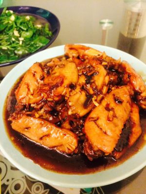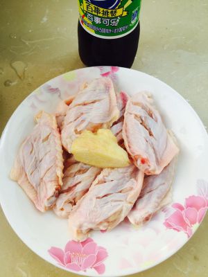 将翅中捞出洗净,将蒜姜切末。锅中放入色拉油(平底锅为好),将蒜姜爆香,改小火,依个放入鸡翅,待鸡翅煎2分钟后加入料酒,不用太多,此时不能盖上锅盖,否则鸡翅的腥味难除,调大火,加入一听左右的可乐,加入少许盐,盖上锅盖。