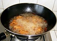 锅中放油烧至六成热,下排骨炸至淡黄色捞出 油温加热至八成,再下锅炸至金黄色捞出。
