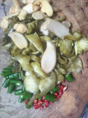 在腌制鱼的时候 可以把其他材料弄好 酸菜是我自己家里泡的 有酸青菜 酸姜 和酸辣椒 都切片