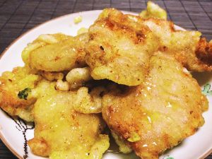 另取一只空碗,将鸡蛋打散加入面粉、清水调成面糊,要保证面粉没有结块,用筷子挑起面糊能缓缓流下。然后将肉片逐一放入面糊中裹一下;