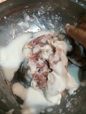 土豆淀粉蓬松度最好,一定要选高粘土豆淀粉。淀粉加点水搅匀,里脊肉切大片,抓匀,挂浆。
