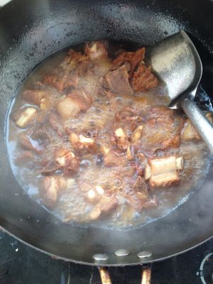 然后依次放入老抽、生抽、糖(量的话根据排骨多少来决定,喜欢口味偏甜的亲可多放些糖)加入适量水盖过排骨大火烧开后调小火慢烧,这慢烧的过程会让排骨更入味。
