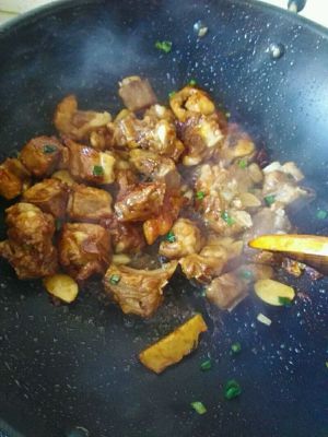 翻炒一下在加入一碗开水进去 刚好淹到排骨就好 (加开水肉感好些 不会那么绵)然后盖上盖子中小火煮二十来分钟