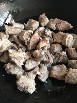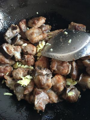 锅里放少油 下几片老姜 把腌制好的排骨倒下去翻炒