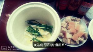 砂锅底垫上大葱姜片,皮朝下放肉,加生抽、老抽、盐、黄酒、水漫过肉。