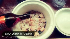 再码上肉块,此时肉皮朝下,加入一汤勺生抽,一汤勺老抽,冰糖,花雕料酒一瓶(全部是料酒,不要加水),用大火烧开转小火炖3小时(一定要小火)