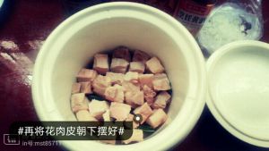 炖好后的肉块,小心移入蒸盅,肉皮朝上,原汤汁去除葱姜和竹签,尽可能去掉表面厚厚的油脂,浇在肉块儿上